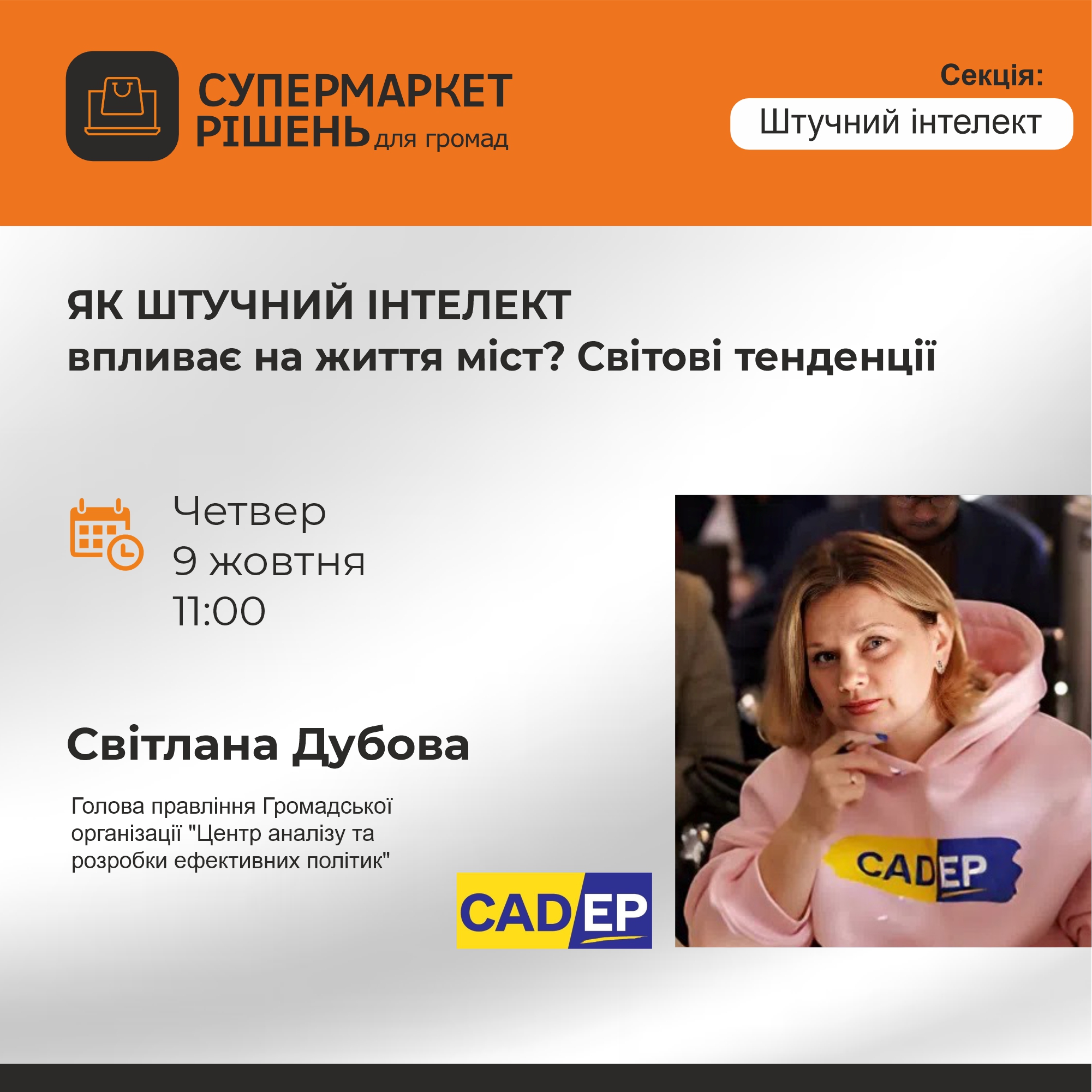 9 жовтня на платформі «Супермаркет рішень для громад» відбулася онлайн-зустріч для представників муніципалітетів, присвячена тому, як штучний інтелект вже сьогодні допомагає містам працювати розумніше. Спікерка – Світлана Дубова, голова ГО «Центр аналізу та розробки ефективних політик (CADEP)». Вона поділилася практичними прикладами й інструментами для місцевого самоврядування.